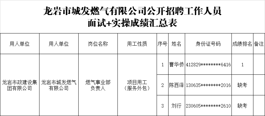 根據(jù)2025年421日發(fā)布的《龍巖市政建設集團有限公司關(guān)于公開招聘工作人員的公告》有關(guān)要求,現(xiàn)將龍巖市城發(fā)燃氣有限公司燃氣事業(yè)部負責人崗位“面試+實操”成績排名予以公示。