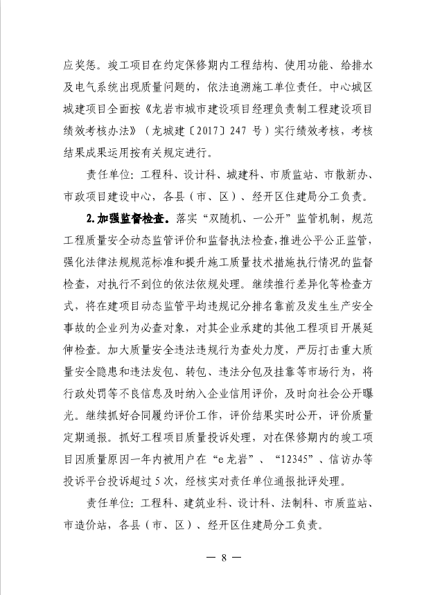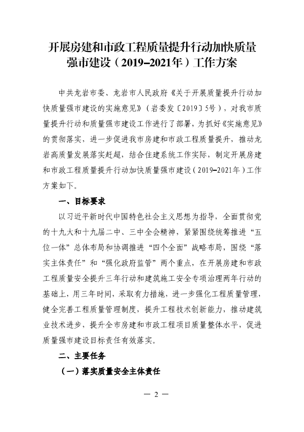 龍巖市住房和城鄉(xiāng)建設局關(guān)于印發(fā)開展房建和市政工程質(zhì)量提升行動加快質(zhì)量強市建設(2019-2021年)工作方案的通知
